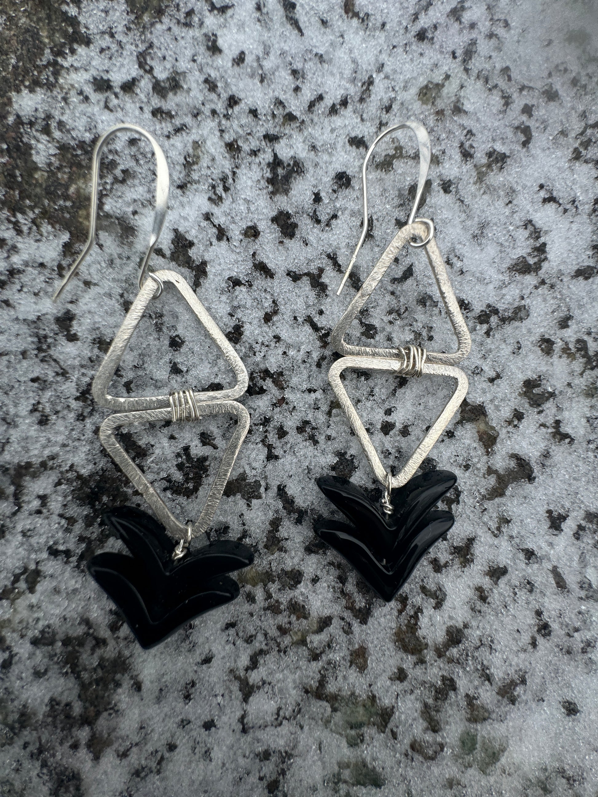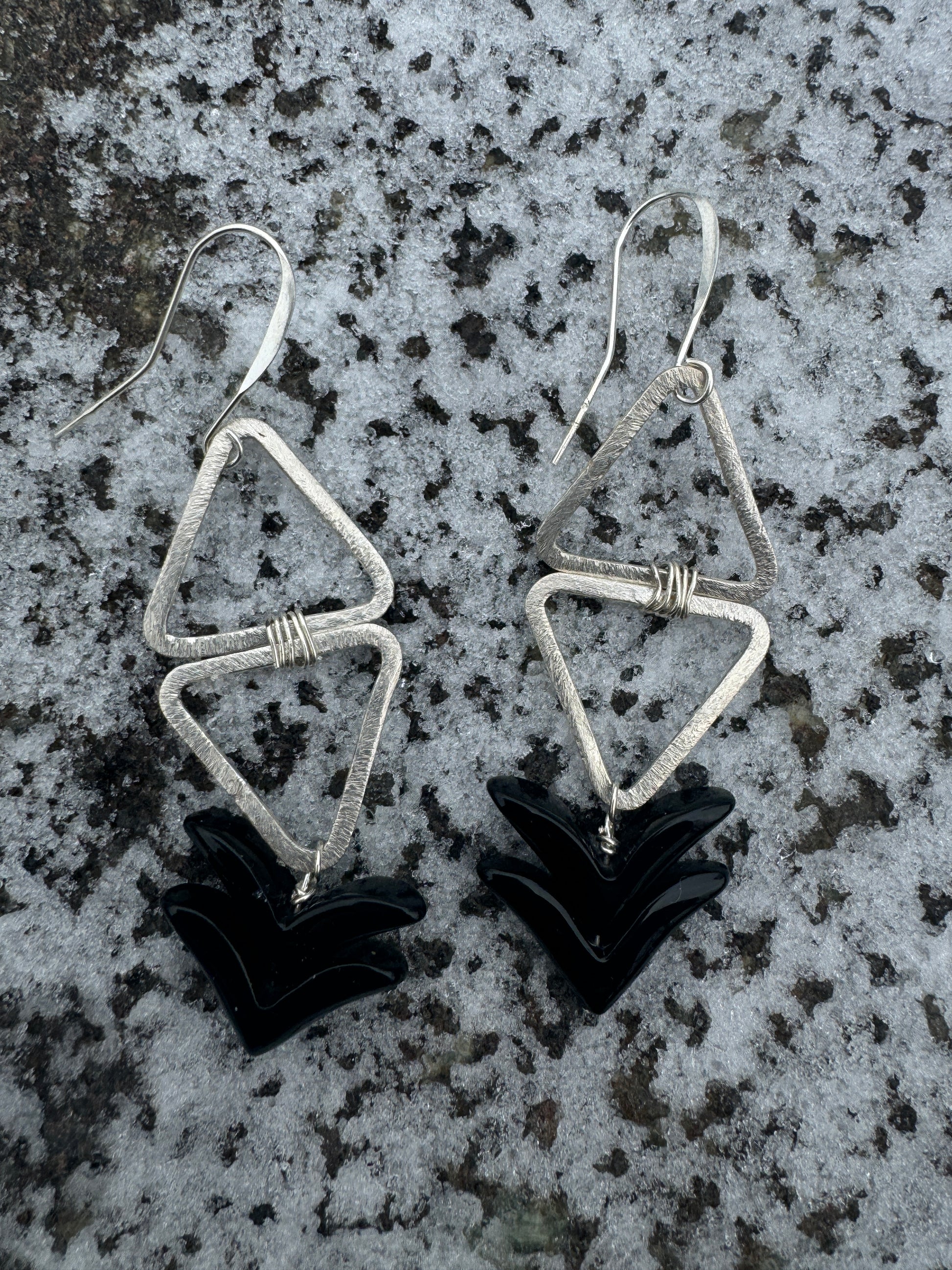 Silver Double Triangle Earrings, w double Black Obsidian Gemstones